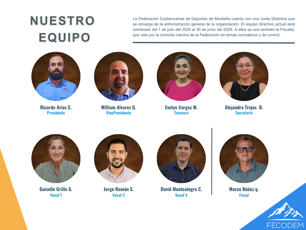 La Federación Costarricense de Deportes de Montaña cuenta con una Junta Directiva que se encarga de la administración general de la organización. El equipo directivo actual está nombrado del 1 de julio del 2025 al 30 de junio del 2029. A ellos se une también la Fiscalía, que vela por la correcta marcha de la Federación en temas normativos y de control.